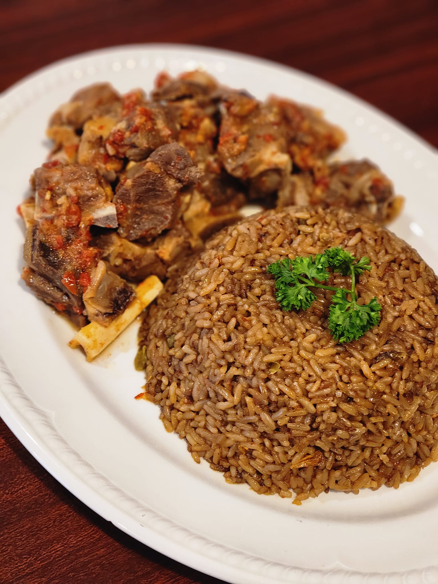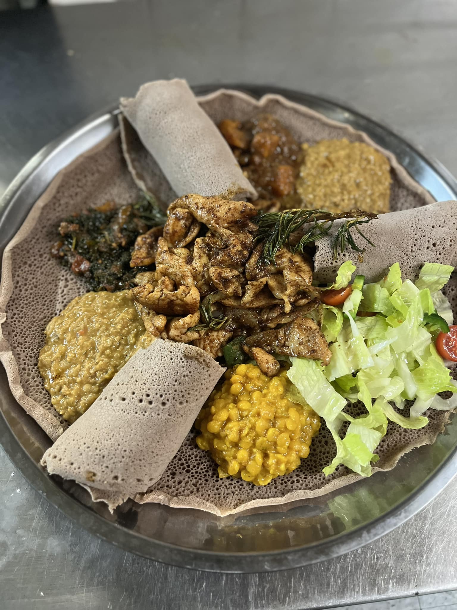 The Tilted Rock is a family restaurant that makes dishes from around the world. Owners Kathy Dameron & Mesfin Yimam wanted to create a place where diners can choose from classic American and African favorites, with other global cuisines in the mix. Choose from appetizers like calamari, prawns, and spring rolls, and enjoy main dishes like American or Ethiopian-style burgers, Tibs, and Siga Wot, plus a variety of soups and stews.