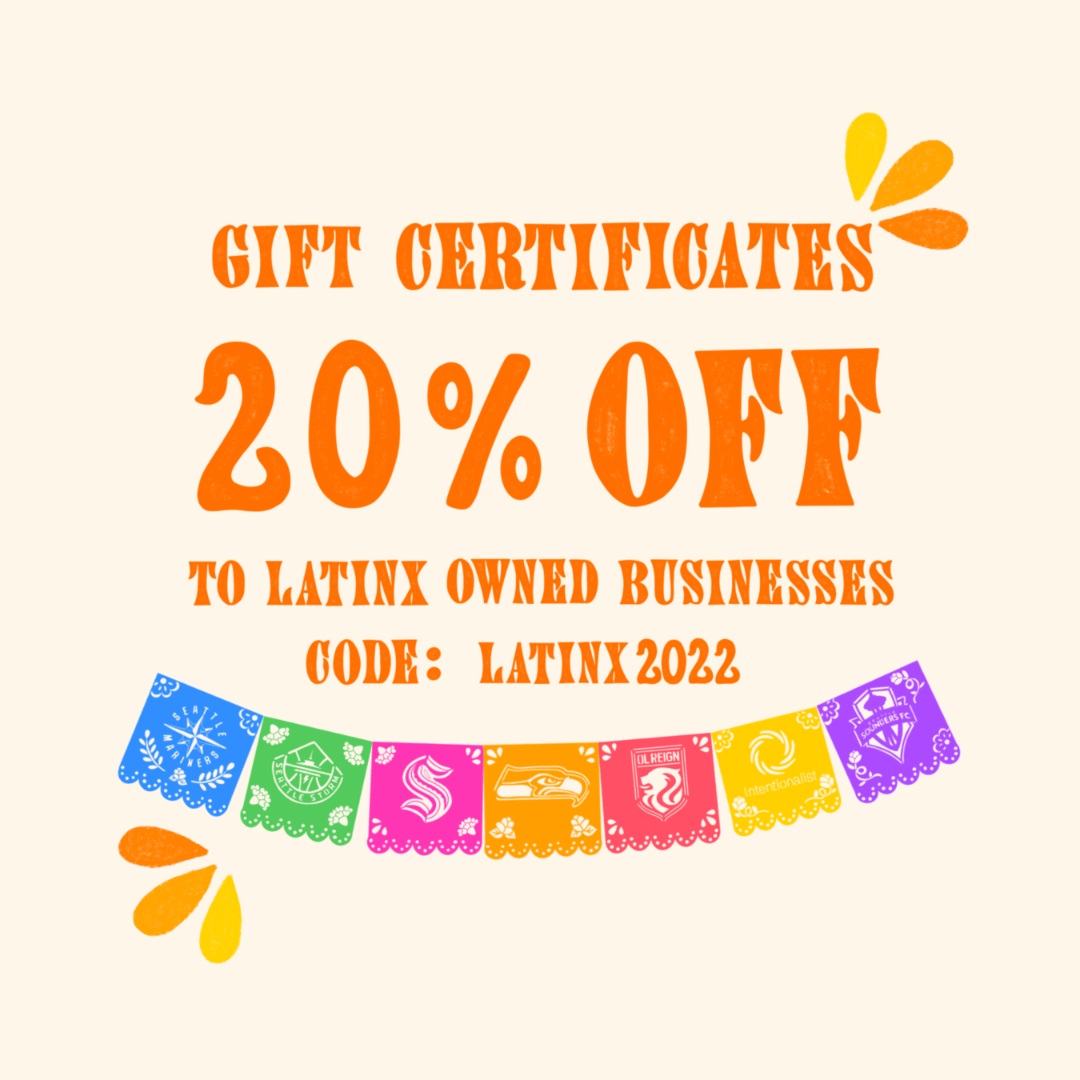 In partnership with Seattle Storm, Seattle Sounders FC, OL Reign, Seattle Seahawks, Seattle Mariners, and Seattle Kraken, Intentionalist is offering a Latinx Heritage Month discount of 20% off on Gift Certificates to Latinx-owned businesses in our Gift Certificate Marketplace.